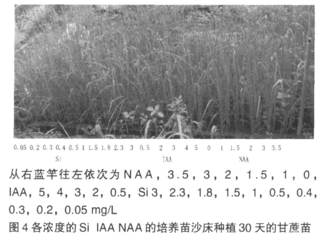 比较硅和NAA的甘蔗苗,发现各浓度的硅都对甘蔗苗的保绿效果明显,明显高于各浓度NAA的培养基的甘蔗苗,在培养基中加入硅的甘蔗苗明显地黄花少,长势好,而其中只加入NAA的明显地黄花多,长势弱,差别非常明显。其中以加入0.4-0.5mg/L的硅保绿效果最好;比较各浓度的IAA和NAA甘蔗苗,发现IAA仍有部分的保绿效果,但没硅明显。