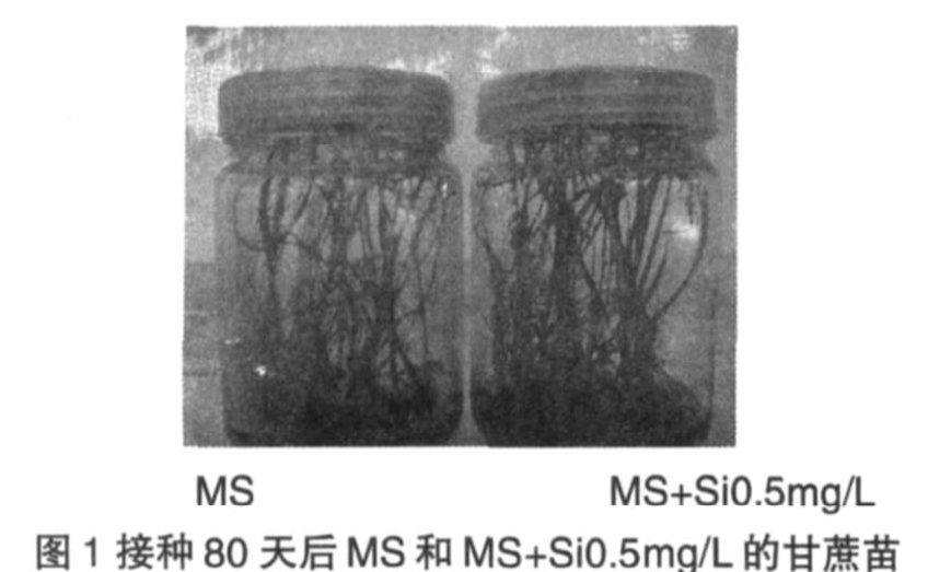 从长势方面看:培养基中加硅0.2-3mg/L甘蔗苗的长势明显高于加人IAA和NAA的,培养基中加NAA的长势最差,加IAA的次之,加硅的最好。但培养基中加NAA 3mg/L和NAA 2mg/L的甘蔗苗明显茎粗。在所有沙床种植甘蔗苗中,以MS培养基(不加其它物质)长势最差,苗细而弱,倒伏多,死亡率高,以加NAA3mg/L的茎最粗,培养基中加NAA 3mg/L,和NAA 2mg/L的沙床种植甘蔗苗长势不明显,在培养基中加硅0.4,0.5,1,1.8,2.3mg/L的沙床种植甘蔗苗的长势差别不明显,其中以培养基中加入硅1mg/L 和硅1.5mg/L的株茎最高,长势也最好,在MS培养基中加入IAA 的长势仅次于硅,MS中加入IAA 3mg/L和IAA 2mg/L的变化不明显,但它们如和加IAA 4mg/L和IAA 5mg/L的相比变化却很明显。长势明显高于后者。