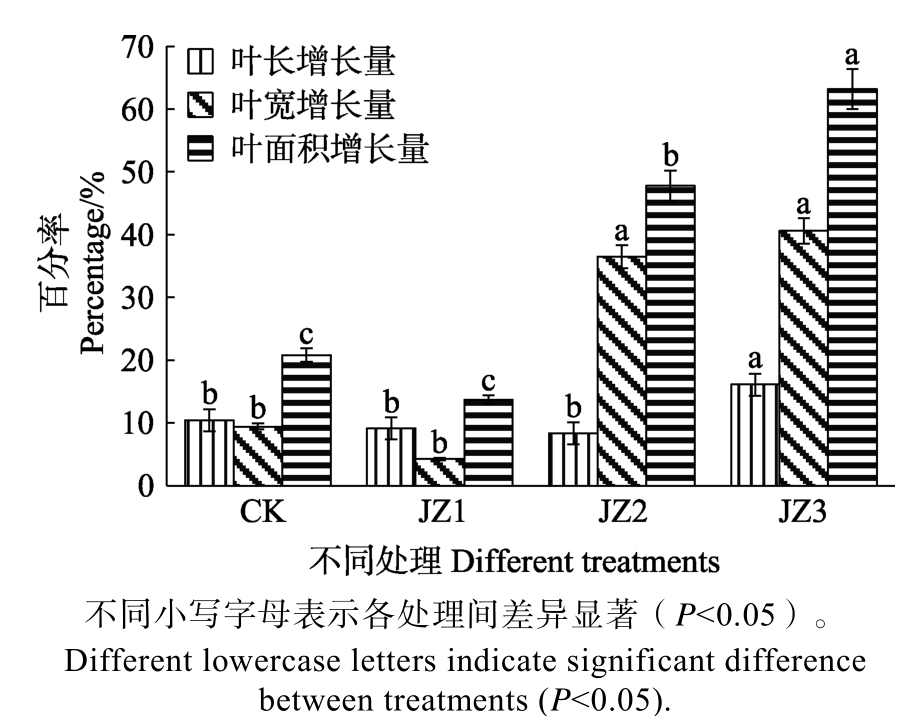 不同基质处理对华石斛91香蕉APP下载苗生长指标有较大差异(图1)。2个月后,JZ2和JZ3的茎长增长量和鲜重增长量显著高于CK和JZ1,其中JZ3的处理最高;CK的茎粗相对增长量显著低于其他3个处理。生长 5个月后,各基质处理华石斛苗叶片变化较为明显,CK和JZ1叶片呈细长状;JZ2和JZ3叶片较宽,生长良好,叶面积增长量显著高于CK和JZ1处理(图2);其中JZ3叶面积增长量为最高,达到63.2%。
