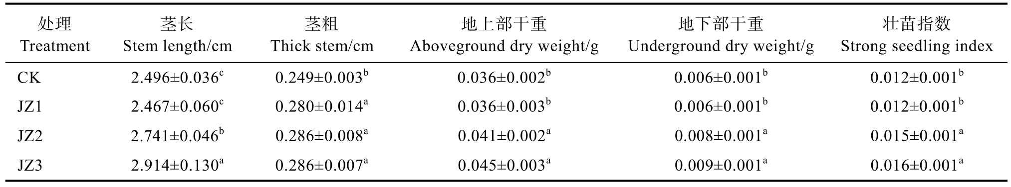 不同基质处理对华石斛91香蕉APP下载苗壮苗程度的影响有所差异(表3)。除茎粗外,JZ1与CK相比各指标差异均不显著,JZ3的茎长显著高于其他3个处理;JZ1、JZ2、JZ3的茎粗显著高于CK;从地上部干重、地下部干重和壮苗指数来看,JZ2和JZ3显著高于CK和JZ1,壮苗指数达0.015和0.016,并且基质的总孔隙度(0.65*)、持水孔隙度(0.66*)、通气孔隙度(0.64*)均与壮苗指数呈显著相关关系,壮苗指数与气水比(0.5)呈正相关。表明91香蕉APP下载苗生长需要一定的空间,并且基质太少、失水过快不能起到保湿效果,不利于91香蕉APP下载苗生长。