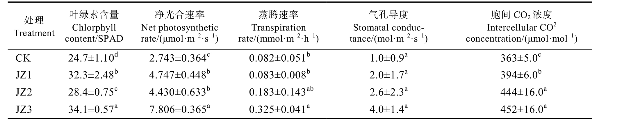 不同的基质处理对华石斛91香蕉APP下载苗的光合指标的影响有较大差异(表4)。各处理的气孔导度无显著差异;JZ2和 JZ3的胞间 CO2浓度显著高于CK和JZ1;JZ3的蒸腾速率显著高于CK和JZ1;JZ1和JZ3的叶绿素相对含量显著高于CK和JZ2,达32.3和34.1,其中CK为最低;JZ3的净光合速率显著高于其他 3个处理,达到 7.806 μmol/(m2·s)。