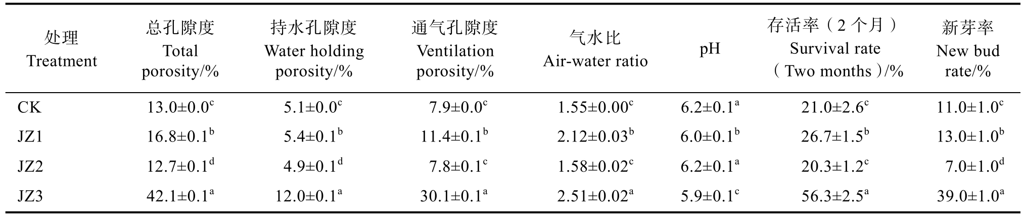 不同基质处理的理化性质有所差异,JZ1和JZ3的容重、总孔隙度和气水比相对较大,且JZ3显著高于其他处理(表2)。JZ1与CK相比,加入树皮后容重、孔隙度和气水比均高于CK处理;CK和JZ2的pH显著高于JZ1和JZ3,但均呈弱酸性,适宜华石斛生长。种植2个月后,华石斛苗生长情况基本稳定,JZ3存活率最高,达56.3%,CK、JZ1、JZ2分别为21.0%、26.7%和20.3%,存活率较低;JZ3的新芽率显著高于其他3种基质,达39.0%。并且基质的总孔隙度(0.98**)、持水孔隙度(0.98**)、通气孔隙度(0.98**)和气水比(0.90**)均与存活率呈极显著相关关系。
